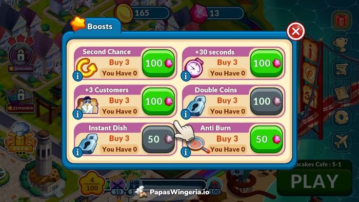 Cooking Festival has temporary boosts you can buy with gems. These boosts are lifesavers on harder levels when customers come in waves.