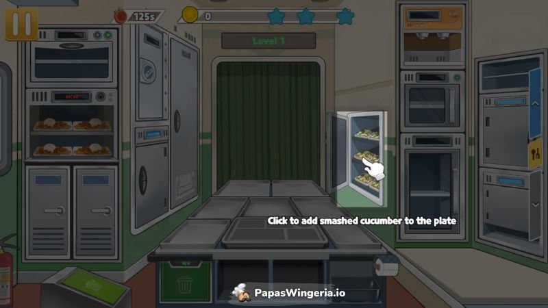 Youâll start with simple plates like curry rice and smashed cucumber salad. The game shows you what to click, like pulling plates from the fridge or heating food before serving.